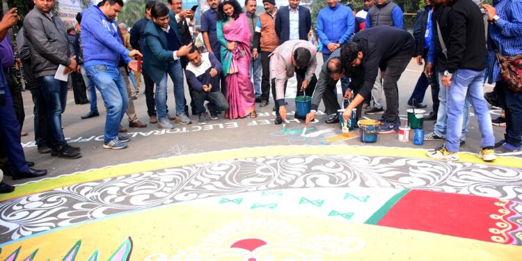 Chief Secretary JK Sinha and Chief Electoral Officer Kiran Gitte was present at the State Level Rangoli Utsav that took place in front of the Rabindra Shatabarshiki Bhawan in capital Agartala.