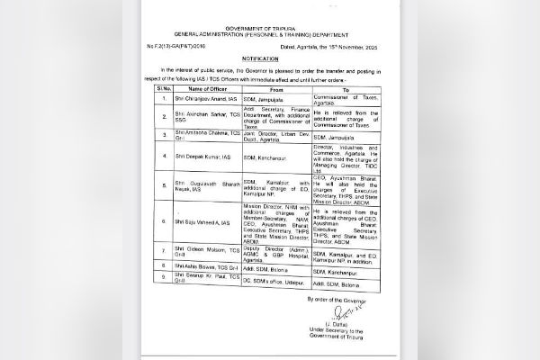 The Tripura government has assigned new responsibilities to several civil servants, with the General Administration (Personnel & Training) Department issuing a transfer and posting order for nine IAS and TCS officers on November 15.