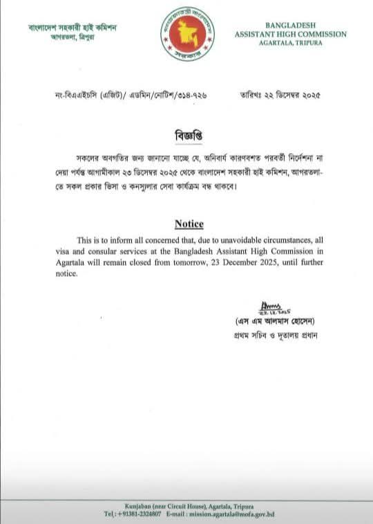 The Bangladesh Assistant High Commission office in Agartala has been closed indefinitely starting December 23, leading to the suspension of all visa and consular services from Tuesday onwards. The sudden shutdown has affected hundreds of applicants who regularly depend on the Agartala mission for travel, medical, business, and family-related documentation.