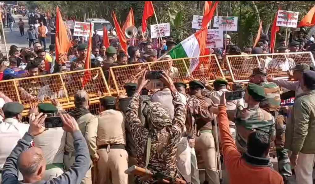 The Vishwa Hindu Parishad (VHP) on Tuesday staged a protest at the Raghna check post and border trade point along the India–Bangladesh border in North Tripura district, demanding an immediate and complete halt to border trade with Bangladesh. The protest was organized in response to recent reports of killings of Hindu men in the neighbouring country, which have sparked outrage among Hindu organizations in Tripura and other parts of India.