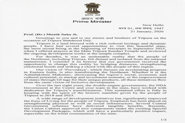 On the occasion of Tripura’s Statehood Day, Prime Minister Narendra Modi extended warm greetings to the people of the state, praising its rich cultural heritage, economic progress, and the resilience of its citizens. In a letter addressed to Chief Minister Dr. Manik Saha, the Prime Minister highlighted Tripura’s remarkable transformation under the “double-engine government” and reaffirmed the Centre’s commitment to inclusive and balanced development in the Northeast.